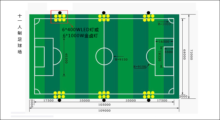 11人制足球場(chǎng)地布燈參考圖: