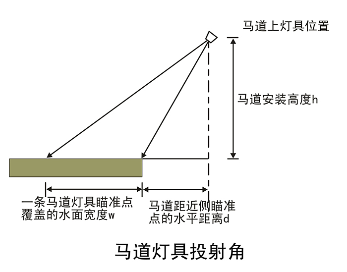 由于每套游泳池照明燈產(chǎn)生的水平照度分量均可疊加,而垂直分量則分為4個不同的方向,不能完全疊加。所以為滿足Eh/Ev在0.75-1.5之間和不產(chǎn)生不舒適眩光的要求,可以近似理解為α1不應(yīng)小于arctan0.75,即不小于37°,而α2不應(yīng)大于55°。馬道燈具瞄準點覆蓋的水面寬度為w,馬道到近側(cè)瞄準點的水平距離為d,馬道燈具的安裝高度為h,三者關(guān)系:0.75h<d<tg50°h-ω即0.75h<d<1.428h-ω,如下圖7陰影部分