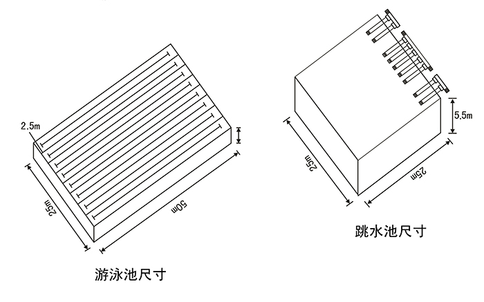 游泳項目:根據(jù)國際標準游泳項目對游泳池要求為長50m,寬至少25m,深2m以上。設(shè)8條泳道,每條泳道寬2.5m,第一和第八泳道的外側(cè)分道線距離池壁為2.5m。 跳水項目:跳水池面積為25m×25m,池深為5.4~5.5m。跳水運動的場地不僅包括跳水池,還包括運動從3米板和10臺躍入水池所經(jīng)過的立體空間范圍。 花樣泳池項目:泳池至少30m、寬20m,在其中12m寬、12m長的區(qū)域內(nèi),水深必須達3m。水的溫度應(yīng)是26℃,誤差±1℃。水必須十分干凈,清澈見底。 水球項目:使用標準50m游泳池,水深超過2m,用水線標出比賽區(qū)域。男子比賽場地是30m×20m,女子比賽場地是25m×20m。