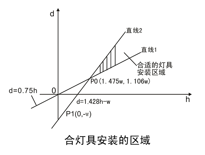 如果要滿足Eh/Ev在0.5-2之間,則α1不應(yīng)小于arctan0.5,即不小于27°,則有0.5h<d<1.428h-w,此時的直線1的方程改為d=0.5h,PO坐標變?yōu)?1.078ω,0.539ω)。只有燈具安裝在上述陰影區(qū)域范圍內(nèi)時,才能兼顧眩光控制和產(chǎn)生4個方向適宜的垂直照度。 |